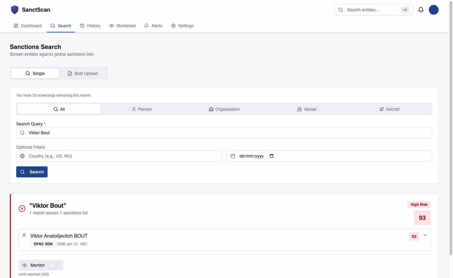 SanctScan offers a free plan with 100 OFAC screenings per month — no credit card required. It screens against 7 sanctions lists including OFAC SDN, EU Consolidated, and UN Security Council, with results in under 200ms.